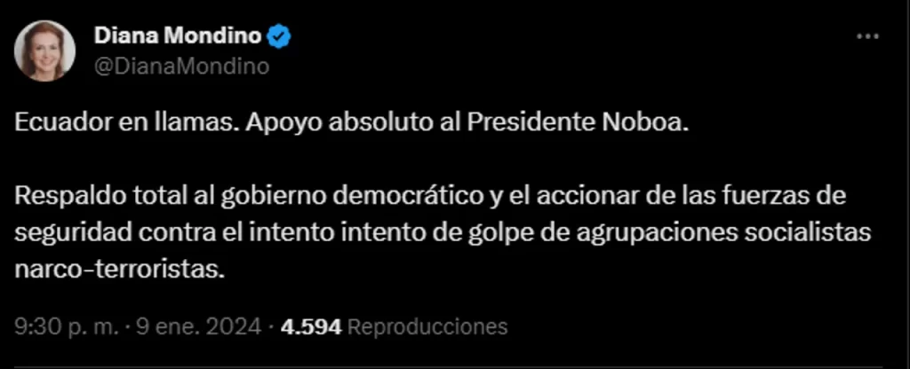 “Ecuador en llamas. Apoyo absoluto al Presidente Noboa”, encabezó su mensaje en la red social X la funcionaria.