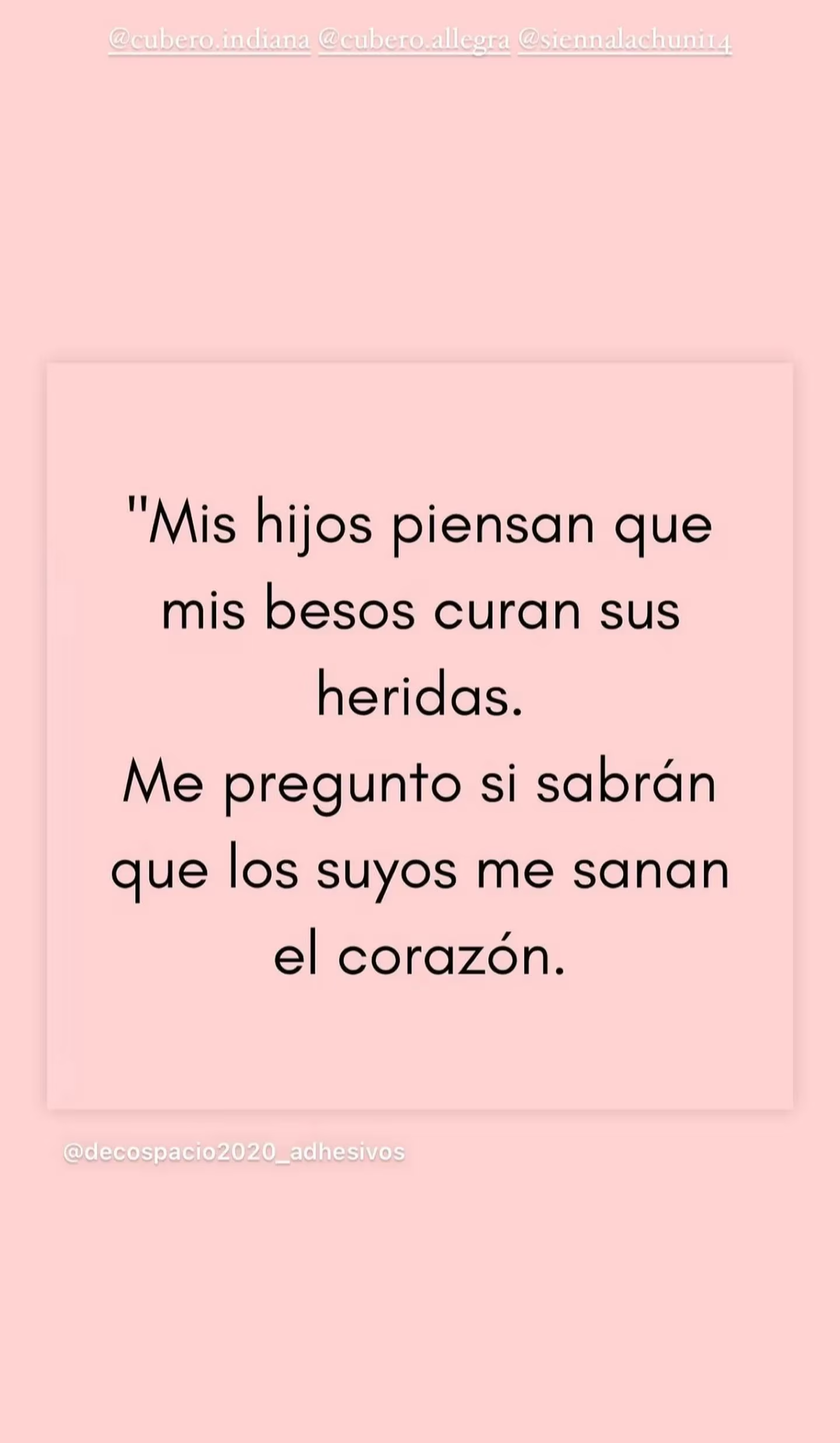 Incluso, en otra publicación compartió una frase y aprovechó para etiquetar a las cuentas de Instagram de Indiana, Sienna y Alegra, las tres nenas que tuvo con Fabián Cubero. “Mis hijos piensan que mis besos curan sus heridas. Me pregunto si sabrán que los suyos me sanan el corazón”, dice el mensaje.