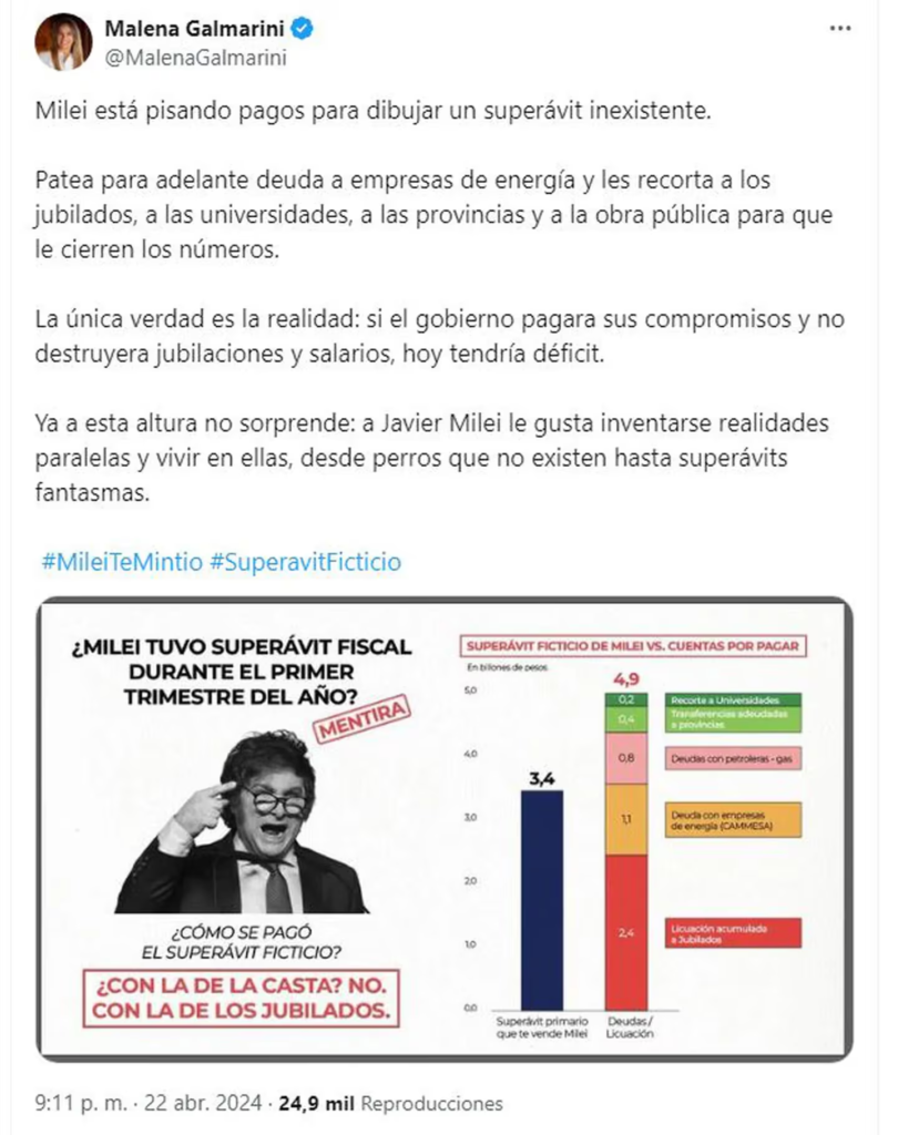 Bajo el hastagh #MileiTeMintio, referentes kirchneristas salieron al cruce del discurso de Javier Milei, en el que anunció que la Argentina alcanzó un superávit del 0,2% en el primer trimestre del año. Apuntaron que se logró “con la plata de los jubilados y el sufrimiento de millones de trabajadores”.