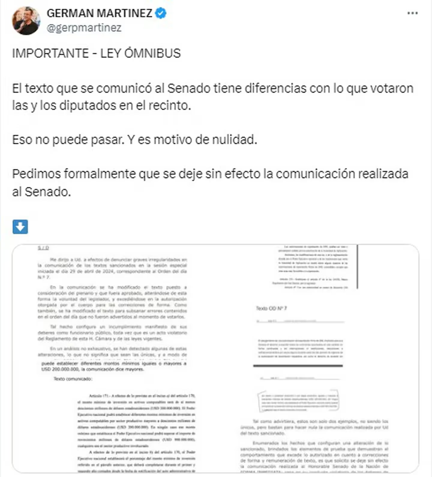 “El texto que se comunicó al Senado tiene diferencias con lo que votaron las y los diputados en el recinto. Eso no puede pasar. Y es motivo de nulidad. Pedimos formalmente que se deje sin efecto la comunicación realizada al Senado”, publicó Martínez, en su cuenta de X (ex Twitter).