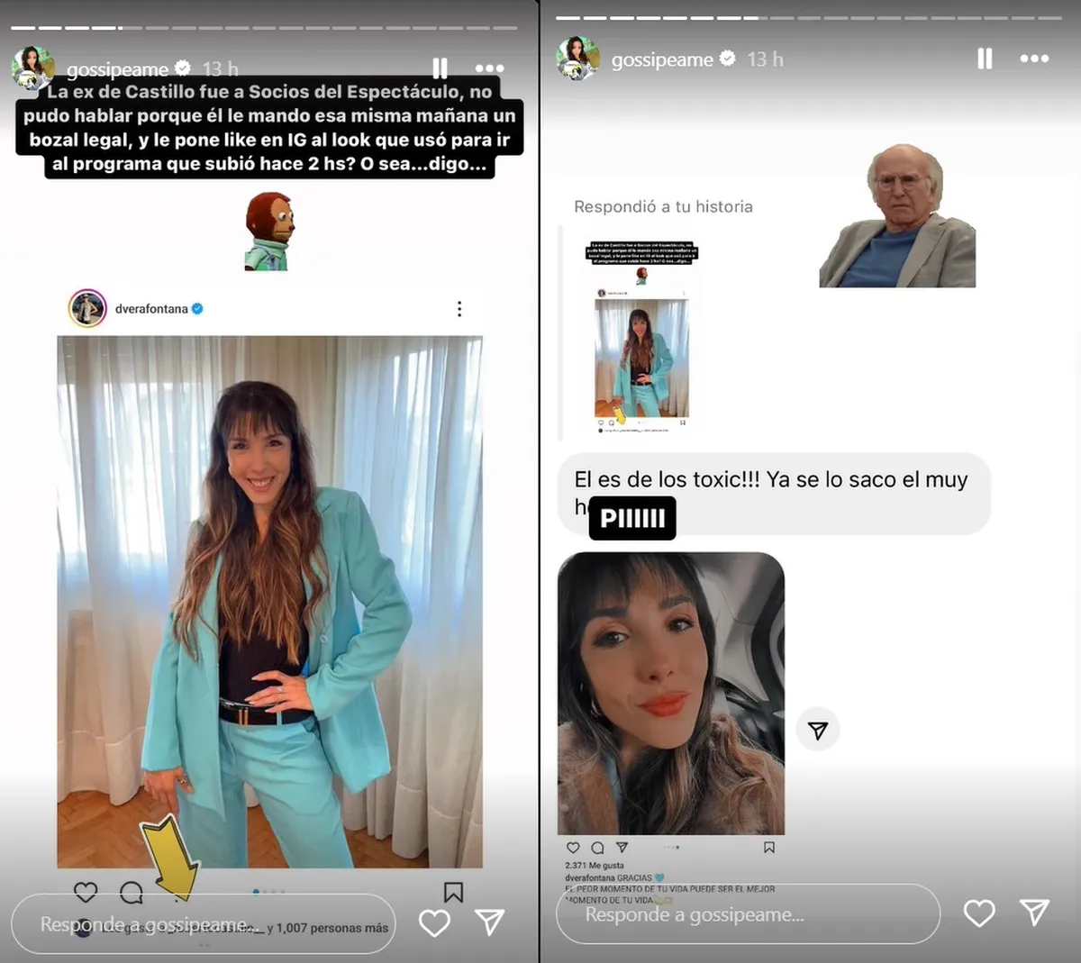 “La ex de Castillo fue a Socios del Espectáculo, no pudo hablar porque él le mandó esa misma mañana un bozal legal, y le pone like en Instagram al look que usó para ir al programa”, contextualizó Pochi al mostrar el posteo.