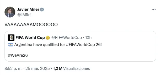 El presidente de la Nación, Javier Milei, celebró la victoria de la Selección argentina ante Brasil por 4 a 1 en el marco de la fecha 14 de las Eliminatorias Sudamericanas que le dieron a la albiceleste la clasificación al Mundial 2026.