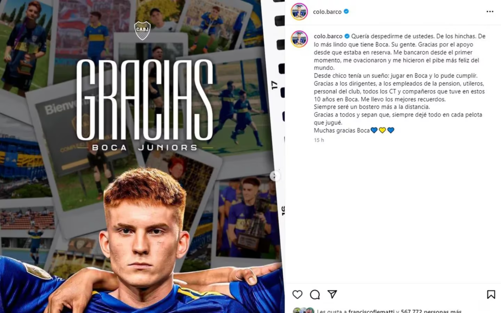 Valentín Barco se convirtió en el nuevo refuerzo de Brighton & Hove. El club inglés, donde tendrá como compañero al argentino Facundo Buonanotte, lo presentó a través de sus redes sociales con un video. Pero antes, el Colo compartió un posteo en su cuenta oficial de Instagram en el que escribió sus últimas palabras como futbolista del Xeneize, en las que no menciona a Juan Román Riquelme.