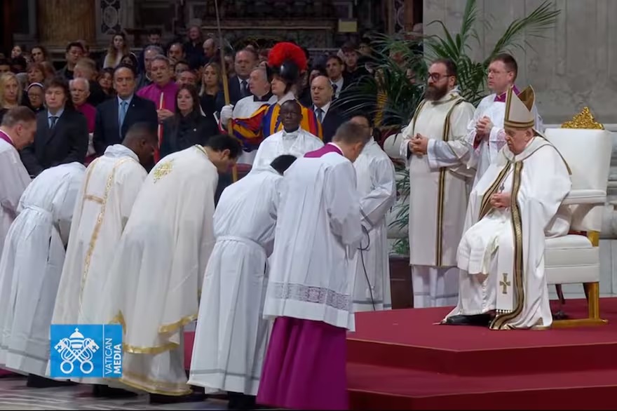 La ceremonia fue precedida por un primer saludo protocolar del Presidente y su delegación -formada por su hermana Karina, secretaria general de la presidencia -vestida ajustada a protocolo, de riguroso negro-, la canciller Diana Mondino, los ministros del Interior y Capital Humano, Guillermo Francos y Sandra Pettovello-, en la sacristía de la Basílica de San Pedro, decorada por un inmenso tapiz con la imagen de la primera santa argentina. Y culminó con un fuerte abrazo que el mandatario argentino le dio al Papa que al final, en silla de ruedas, se acercó a saludarlo otra vez al retirarse del templo. El abrazo fue impactante y una buena señal después de un pasado conflictivo y en vista de la audiencia oficial que Milei tendrá mañana lunes con el máximo jefe de la Iglesia católica.