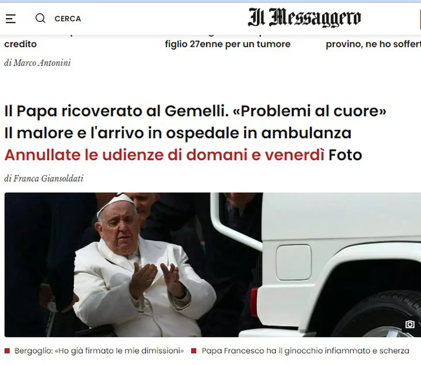 En tanto, otros medios hablaron de problemas cardíacos. “El Papa hospitalizado en Gemelli. Problemas cardíacos, enfermedad y llegada al hospital en ambulancia: mañana y viernes audiencias canceladas”, reza el título del portal Il Messagero.