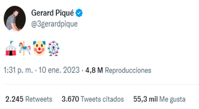 “Entendí que no es culpa mía que te critiquen; yo solo hago música, perdón que te sal-pique”, diría una de las frases de la BZRP Music Session #53 en la que la artista haría referencia a la infidelidad sufrió del padre de sus hijos. Por eso, el exmarido de la cantante colombiana se sumó a la ola de repercusiones expresándose a través de Twitter con una serie de emojis que representan las palabras “circo” y “payaso”.