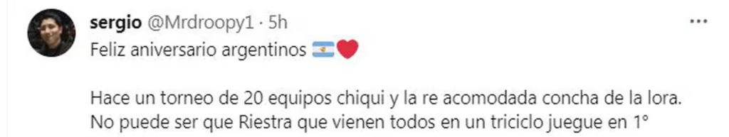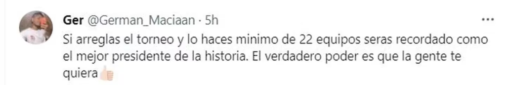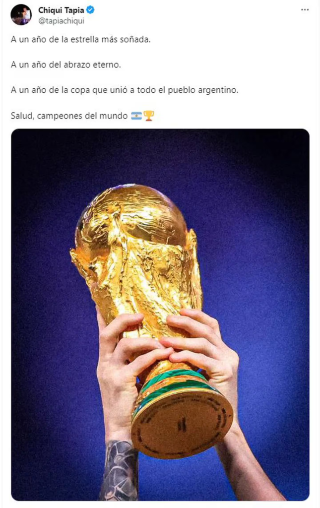 “A un año de la estrella más soñada. A un año del abrazo eterno. A un año de la copa que unió a todo el pueblo argentino. Salud, campeones del mundo”, fueron las frases que utilizó el mandamás de la AFA a un año de la Copa del Mundo. Inmediatamente, los usuarios al ver su publicación le hicieron un pedido tajante: “torneo de 20 equipos”.