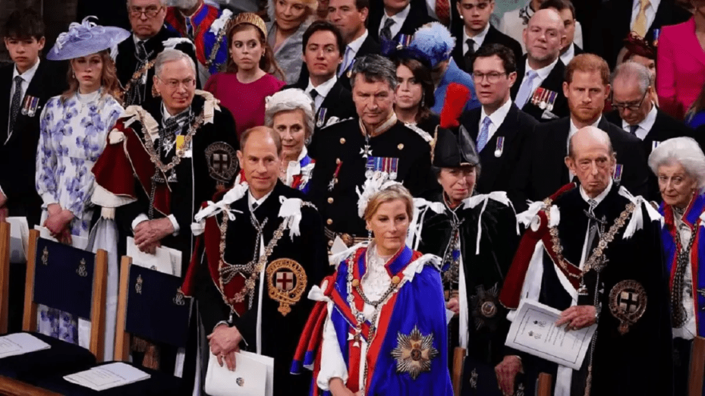 Más temprano, cuando el Príncipe Harry entró en la abadía, vestido con un traje de etiqueta y con medallas, se le observó sonriendo a los invitados mientras caminaba por la nave de la abadía, antes de conversar con varios miembros de la familia.
