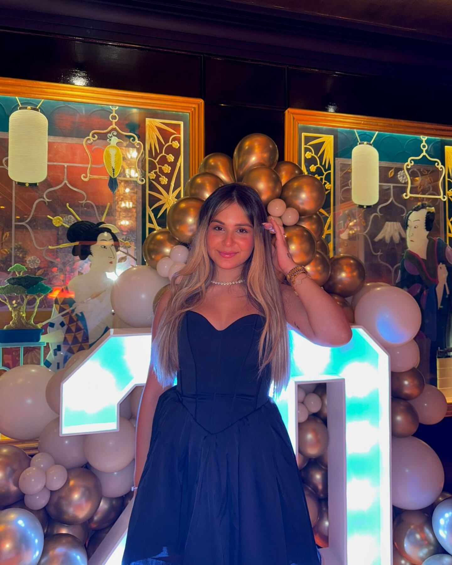 En el marco del festejo por su cumpleaños número 20, la it girl publicó una serie de fotos de su fiesta, a puro glamour, rodeada de globos y con un cartel luminoso. Con un minivestido negro de escote corazón y falda amplia, lo que más llamó la atención de la apuesta fue el pelo: después de años, se sacó el clásico flequillo recto que la caracterizaba.
