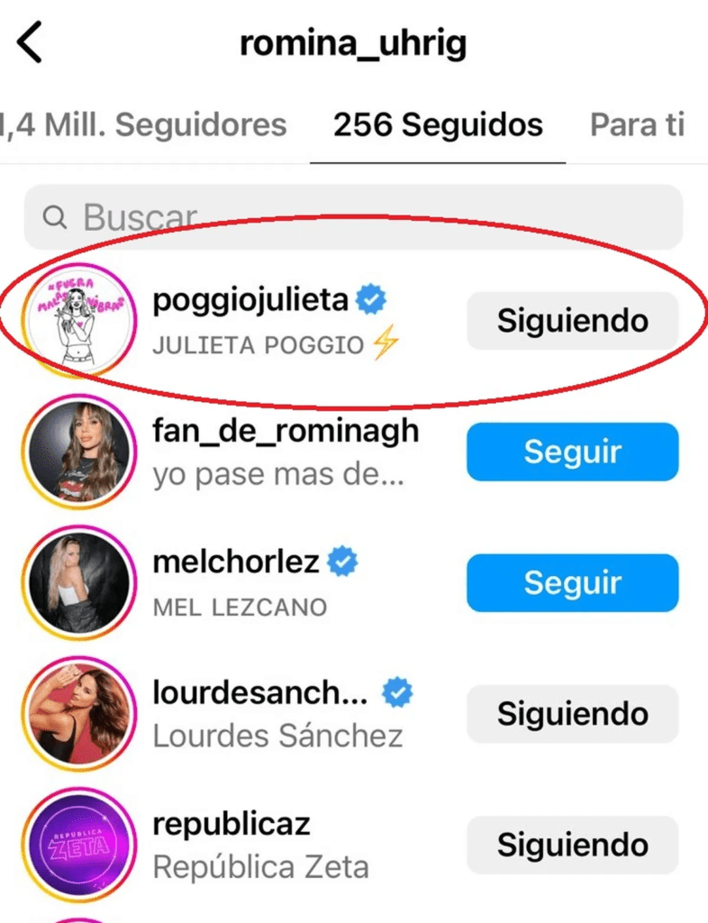 Y la realidad es que en estos tiempos, seguir o dejar de seguir a alguien en redes sociales es toda una señal. Así, Juariu compartió una captura donde se ve que «Romina dejó de seguir a Juli Poggio» y le agregó un «Chan» gigante en señal de alerta. En tanto, Berardi contó lo mismo de sus redes con otra captura de pantalla.