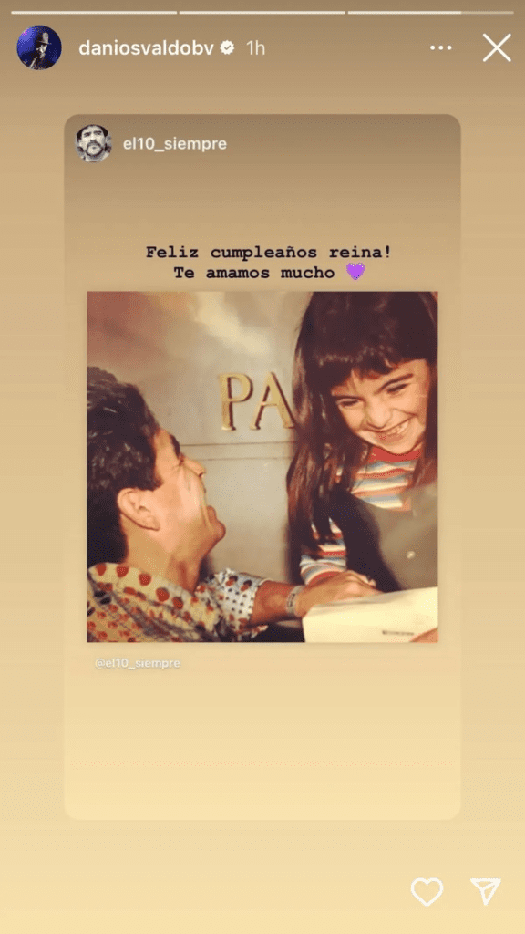 «Feliz cumpleaños a la mujer que fue, es y será la mujer de mi vida», publicó en sus Instagram Stories con una foto en la que se ve abrazado a la hija de Diego Maradona y Claudia Villafañe.