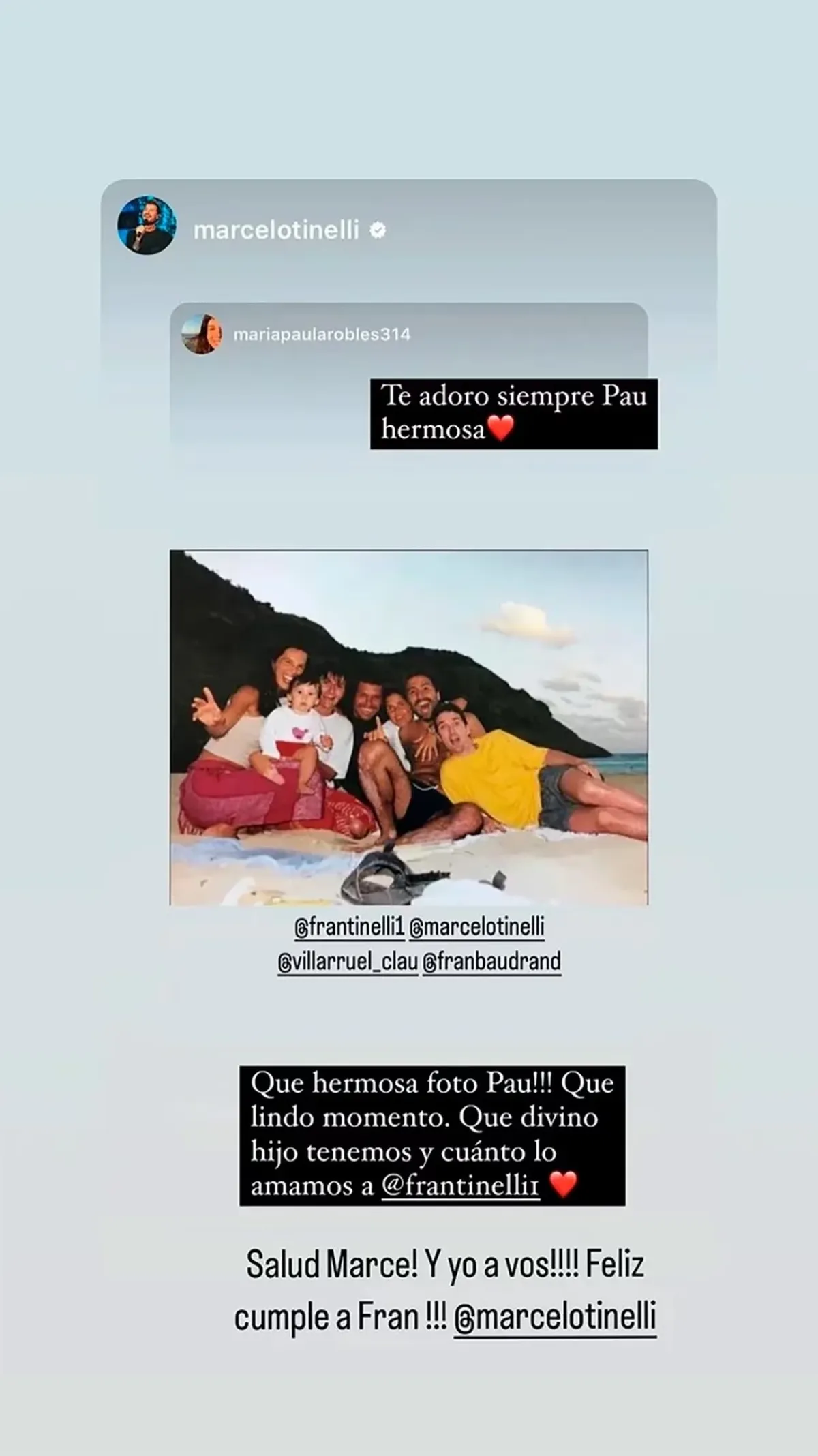 Una de ellas, que compartió ella y reposteó él, es de la familia junto a varios amigos en una paradisíaca playa, y la dedicatoria lo dice todo. «Te adoro siempre, Pau hermosa… Qué hermosa foto, Pau… Qué lindo momento… Qué divino hijo tenemos y cuánto amamos a Fran», expresó Marce.