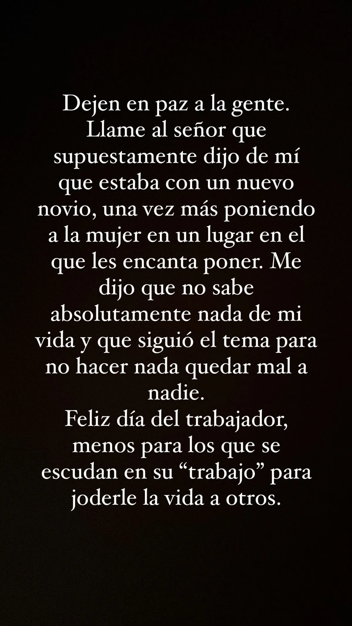 La ex de Rusherking dijo que habló con el exrepresentante de futbolistas para que le dé una explicación por sus dichos. «Dejen en paz a la gente. Llamé al señor que supuestamente dijo de mí que estaba con un nuevo novio, una vez más poniendo a la mujer en un lugar en el que les encanta poner. Me dijo que no sabe absolutamente nada de mi vida y que siguió el tema para no hacer quedar mal a nadie. Feliz día del trabajador, menos para los que se escudan en su ‘trabajo’ para joderle la vida a otros», escribió la China Suárez en una de las historias de Instagram.