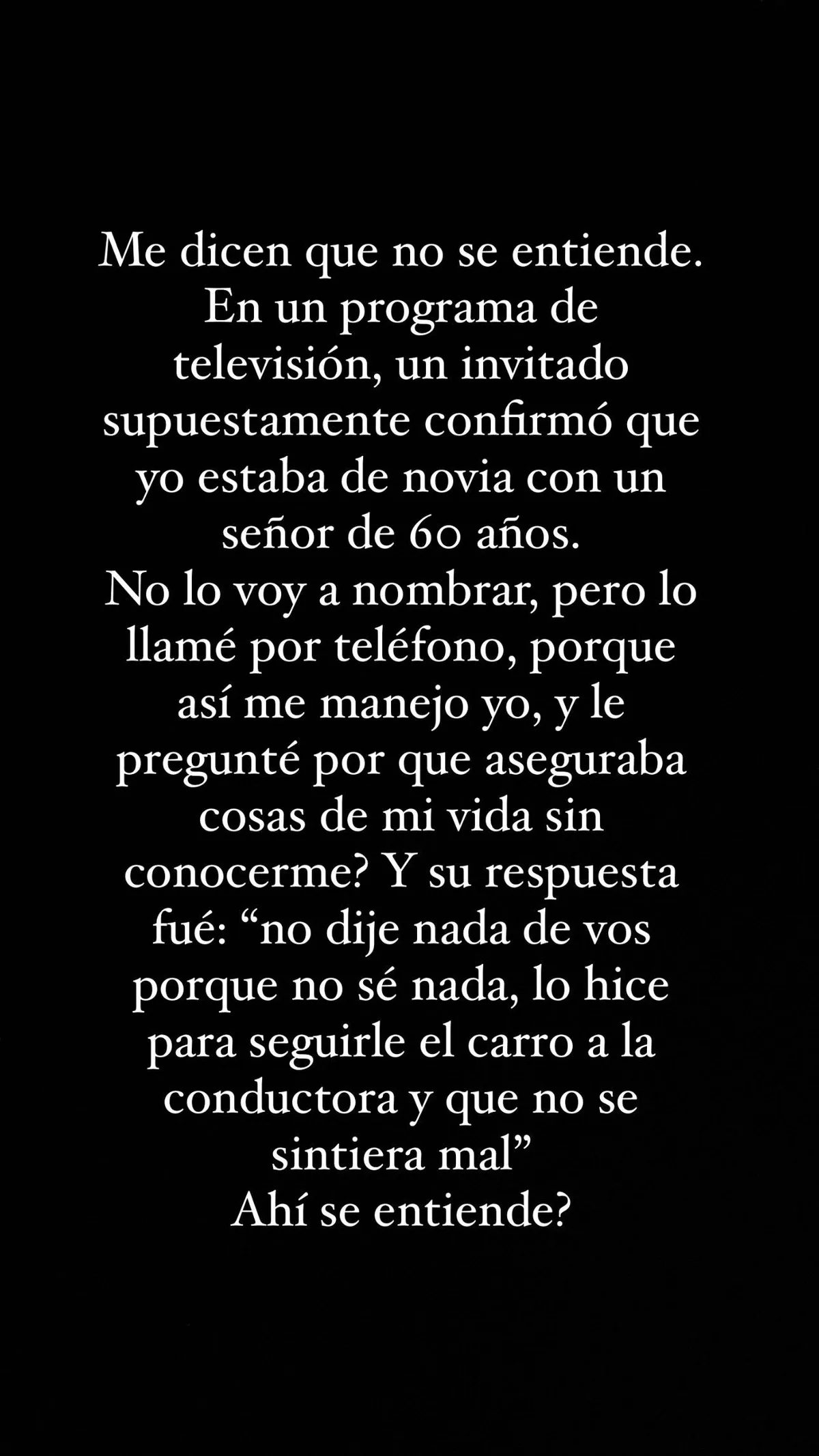 «Me dicen que no se entiende. En un programa de televisión, un invitado supuestamente confirmó que que yo estaba de novia con un señor de 60 años. No lo voy a nombrar, pero lo llamé por teléfono, porque así me manejo yo, y le pregunté por qué aseguraba cosas de mí vida sin conocerme. Y su respuesta fue: ‘No dije nada de vos porque no sé nada, lo hice para seguirle el carro a la conductora y que no se sintiera mal'», detalló sobre el llamado que tuvo con Guillermo Coppola.
