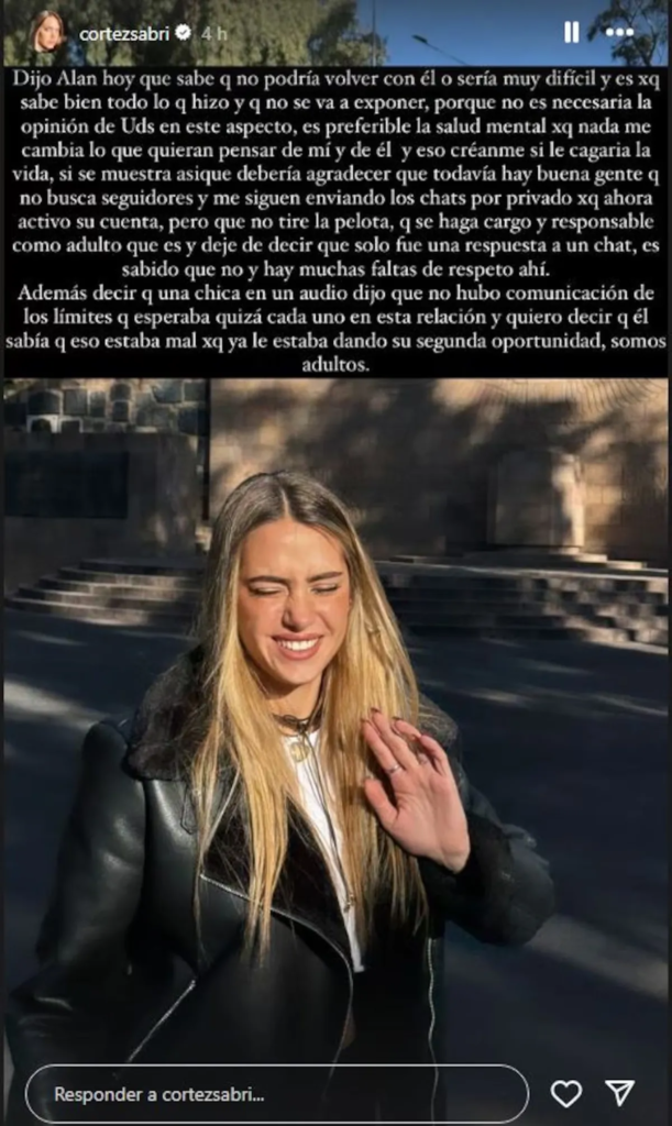 “Hoy dijo Alan que sabe que no podría volver con él o sería muy difícil y es porque sabe bien todo lo que hizo y que no se va a exponer porque no es necesaria la opinión de ustedes en este aspecto”, comenzó diciendo Sabrina en una publicación que subió a Instagram Stories.