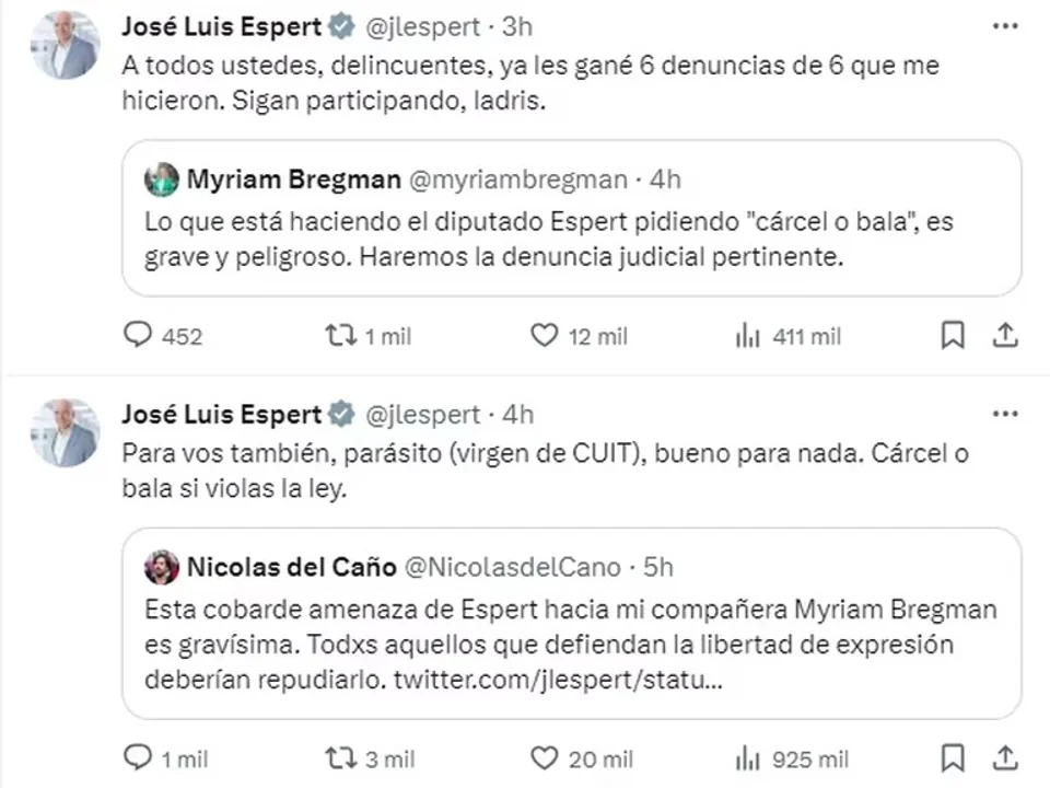“A todos ustedes, delincuentes, ya les gané 6 denuncias de 6 que me hicieron. Sigan participando, ladris”, chicaneó el dirigente liberal que después atacó a la otra legisladora de la Izquierda, Romina Del Plá, quien había expresado su “solidaridad” con Bregman y repudiado “este nuevo intento de acallar la protesta social”. “Si no fuera tan grave el tema, Espert te recordaría que habiendo un nuevo gobierno de ultraderecha, no sos ni aguatero suplente”, expresó Del Plá. “Che cacatúa ensamblada en La Salada ¿quién te abrió la jaula a vos?”, contraatacó el economista.