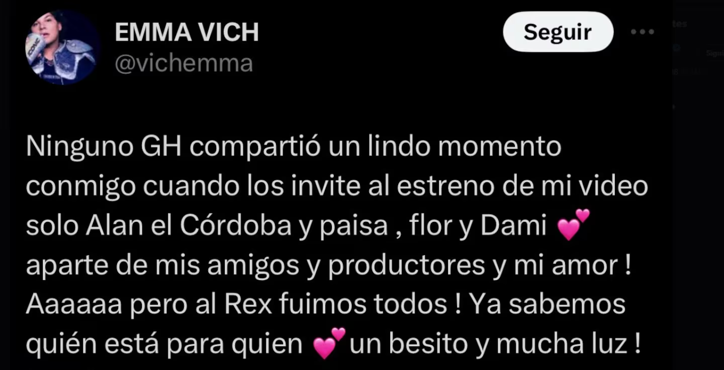 “Ninguno de GH compartió un lindo momento conmigo cuando los invité al estreno de mi video, solo Alan, el Córdoba, Paisa, Flor, Dami, además de mis amigos, productores y mi amor”, expresó Vich, visiblemente molesto.