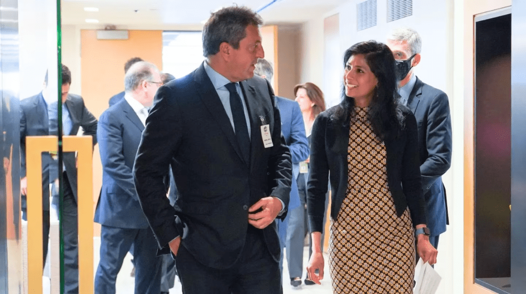Antes de la reunión entre los presidentes Alberto Fernández y Joe Biden en la Casa Blanca, el ministro de Economía, Sergio Massa se reunió con Gita Gopinath, -la número dos del Fondo Monetario Internacional-, mientras el directorio ejecutivo del organismo analiza si aprueba una flexibilización de las metas de reservas.