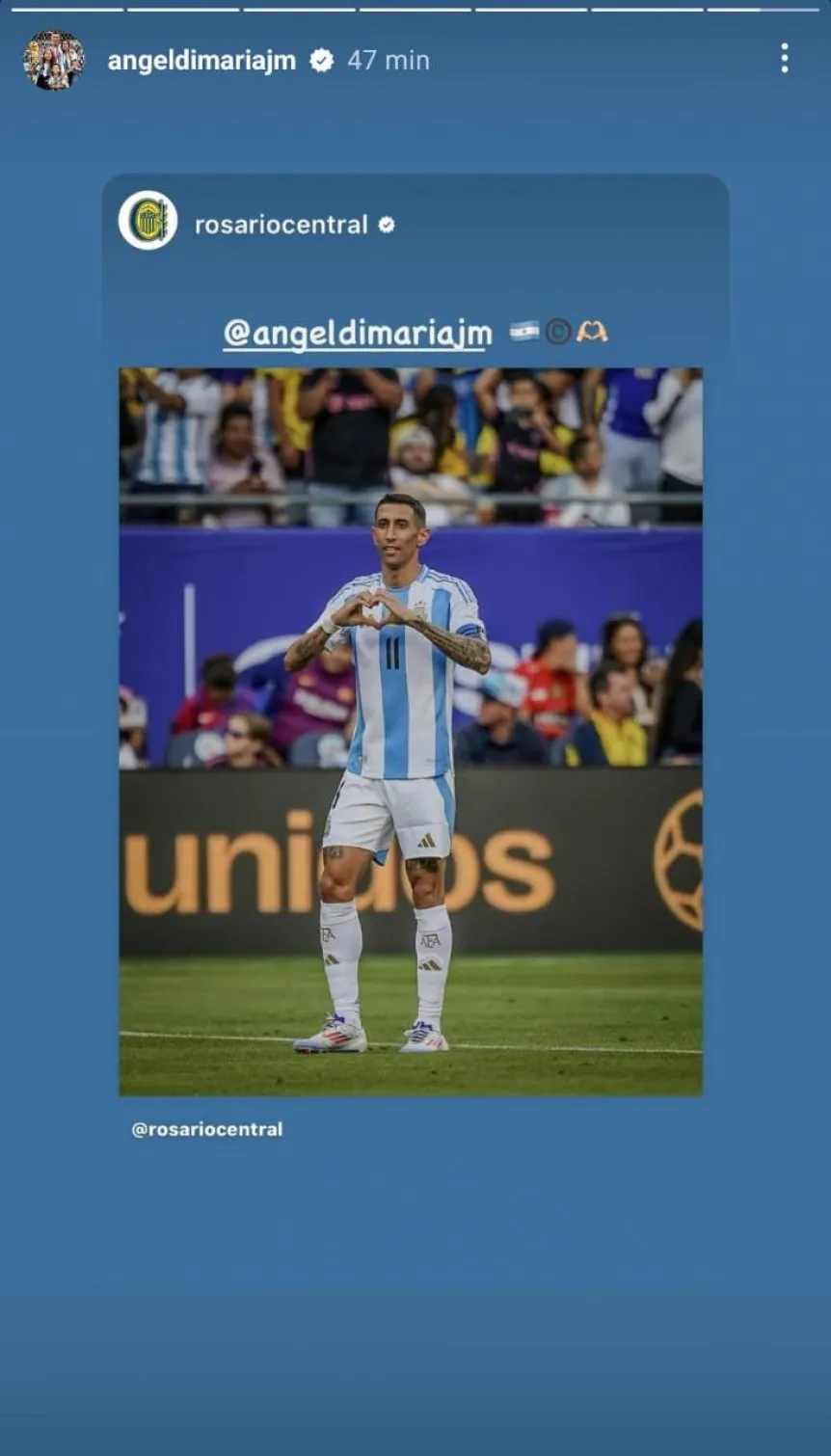 Ángel Di María convirtió el gol del triunfo de la Selección Argentina ante Ecuador en el marco de un amistoso previo a la Copa América y recibió muchas felicitaciones por su tanto pero dentro de todas se destacó la de Rosario Central, la cual replicó en su cuenta de Instagram disparando los rumores sobre un potencial retorno al no estar definido su futuro tras confirmarse que no seguirá en Benfica.