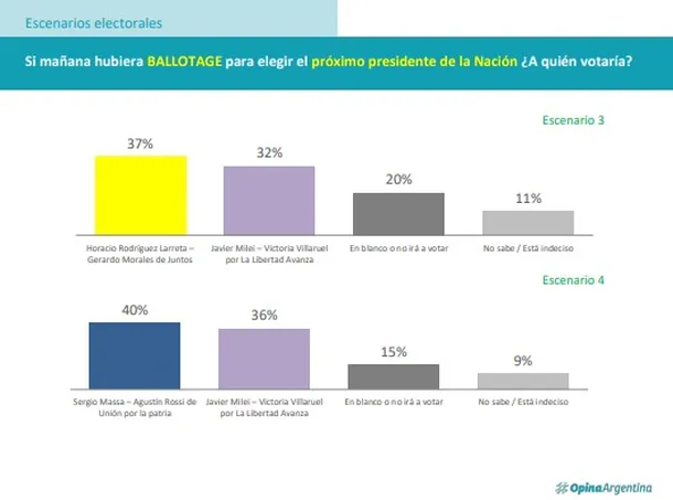 Rodríguez Larreta lograría el 39% de los votos contra el 38% de Massa. Y si el ballotage fuese entre Larreta y Milei, el jefe de gobierno porteño obtendría el 37% contra el 32% de los libertarios.