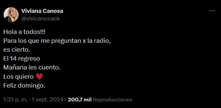 La presentadora televisiva también utilizó sus redes sociales para hablar de su regreso: “Faltan 13 días. Vuelvo a la radio”, escribió en una historia. Mientras que ayer en su perfil de X, la periodista detalló: “¡Hola a todos! Para los que me preguntan por la radio, es cierto. El 14 regreso. Mañana les cuento. Los quiero”. Por el momento, Viviana Canosa no dio muchos detalles sobre su nuevo programa y el horario en el que se emitirá.