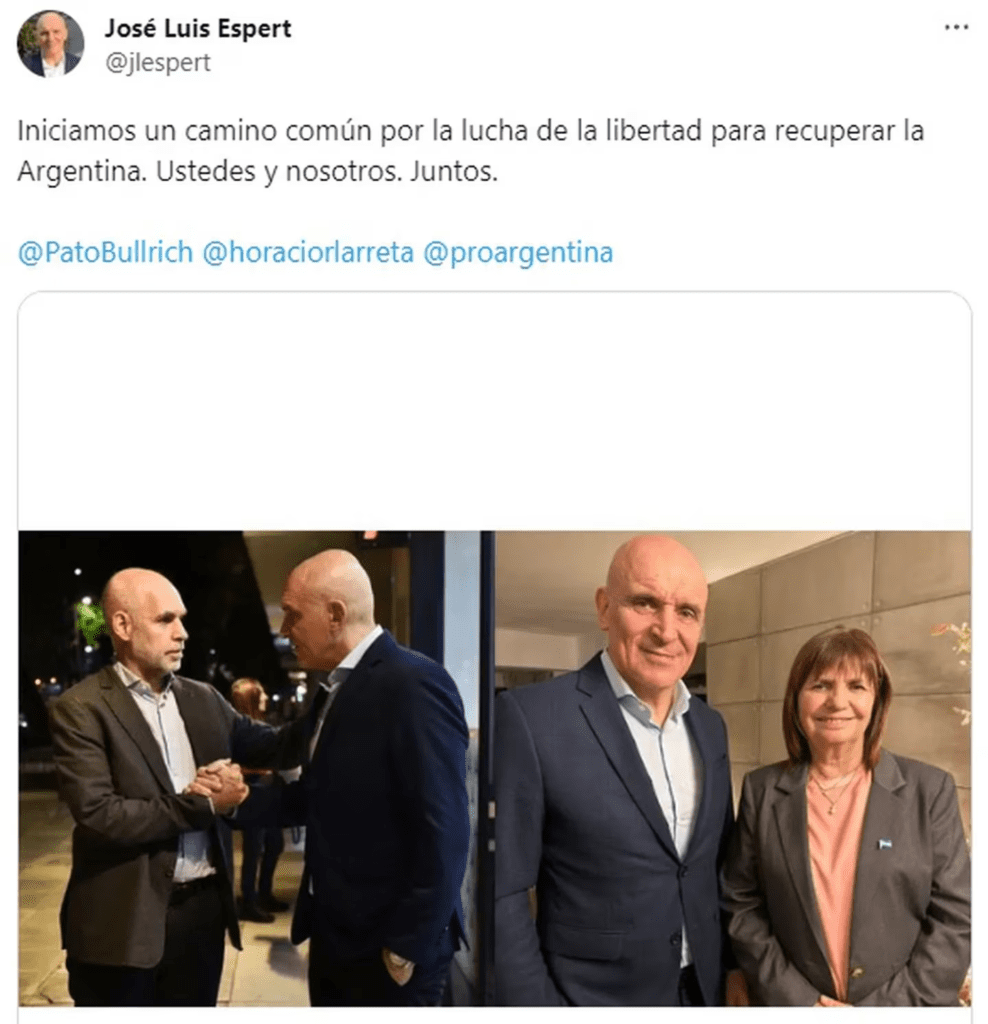 El mandatario porteño agregó: “¡Bienvenido José Luis Espert! Un economista prestigioso con una profunda vocación de cambio, defensor de la democracia y de las ideas de la libertad! A partir del 10 de diciembre vamos a empezar juntos a hacer el cambio de nuestras vidas”.