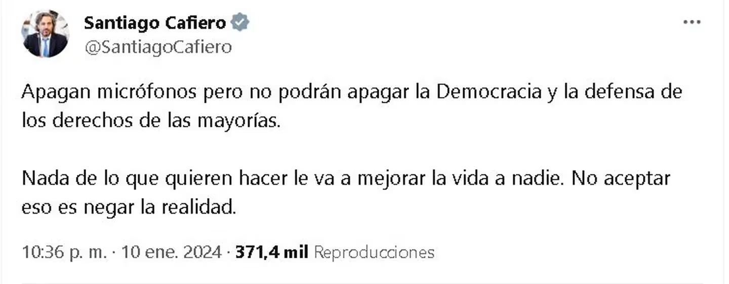 Cafiero aludió al cruce con Espert en un mensaje en la red social X. “Apagan micrófonos pero no podrán apagar la Democracia y la defensa de los derechos de las mayorías”, tuiteó.