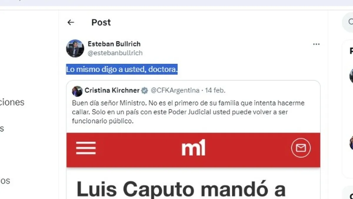 En las últimas horas, Esteban Bullrich se sumó a la respuesta del mensaje expuesto por Cristina Kirchner: «Lo mismo digo a usted, doctora», manifestó en X.