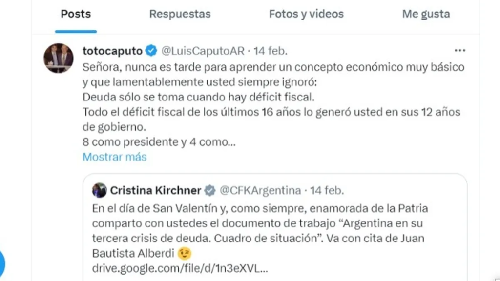 En ese contexto, «Toto» Caputo le contestó por la red social «X», ex Twitter. «Tenga la dignidad de permanecer callada», expresó y, de inmediato, agregó que «toda la deuda que se generó en los últimos 16 años fue consecuencia de sus políticas económicas».