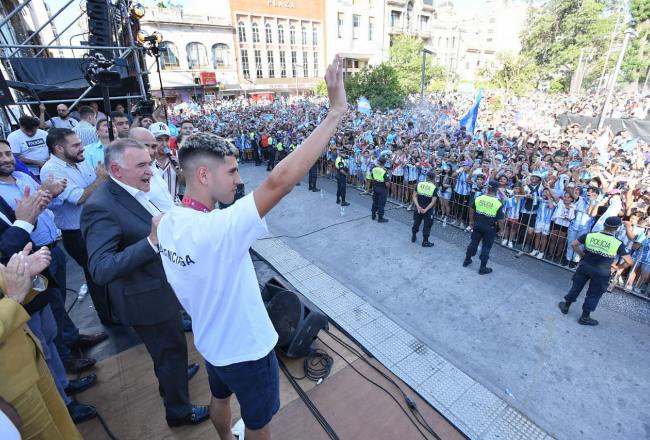 Luego, en Plaza Independencia, el campeón del mundo junto a Lionel Messi en Qatar recibió el clamor popular por parte de miles de hinchas que se dieron cita en Plaza Independencia. Allí, en un escenario montado sobre la explanada de Casa de Gobierno, el «Tucu» fue ovacionado y colmado de reconocimientos.
