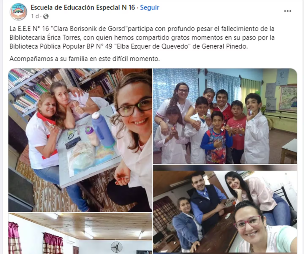 “La E.E.E N° 16 ‘Clara Borisonik de Gorsd’ participa con profundo pesar el fallecimiento de la Bibliotecaria Erica Torres, con quien hemos compartido gratos momentos en su paso por la Biblioteca Pública Popular BP N° 49 ‘Elba Ezquer de Quevedo’ de General Pinedo. Acompañamos a su familia en este difícil momento”, expresaron, junto a una serie de fotos de la víctima.