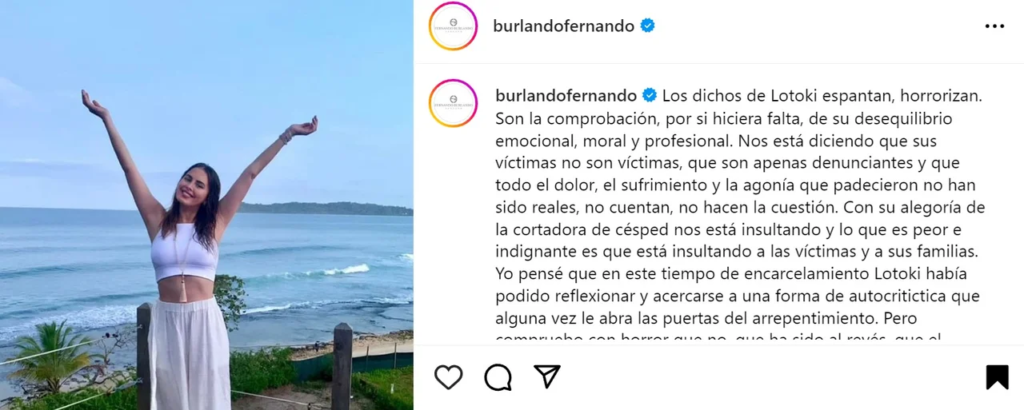 «Yo pensé que en este tiempo de encarcelamiento Lotocki había podido reflexionar y acercarse a una forma de autocritica que alguna vez le abra las puertas del arrepentimiento. Pero compruebo con horror que no, que ha sido al revés, que el encierro ha potenciado su perversidad, su soberbia, su desprecio por la vida y sentido de la impunidad. Ahora la culpa la tiene, según su nueva fantasía, el fabricante del veneno que suministró a sus víctimas. Salvando las distancias, es Jack el Destripador haciendo responsable al fabricante de la navaja que usaba. ¿Tengo que repetir los motivos de su detención?», compartió en sus redes sociales junto a una imagen de Silvina Luna vestida de blanco y con los brazos abiertos.