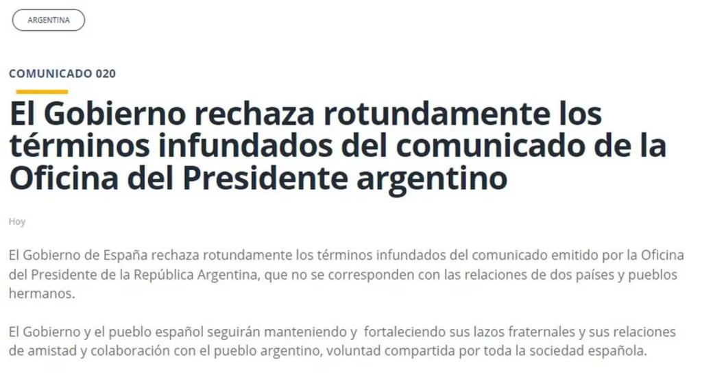 Esta mañana, el Ministerio de Asuntos Exteriores de España cruzó al Ejecutivo nacional y expresó su rechazo al comunicado de la Oficina del Presidente de la República Argentina. “El Gobierno de España rechaza rotundamente los términos infundados del comunicado emitido por la Oficina del Presidente de la República Argentina, que no se corresponden con las relaciones de dos países y pueblos hermanos. El Gobierno y el pueblo español seguirán manteniendo y fortaleciendo sus lazos fraternales y sus relaciones de amistad y colaboración con el pueblo argentino, voluntad compartida por toda la sociedad española”, expresaron.
