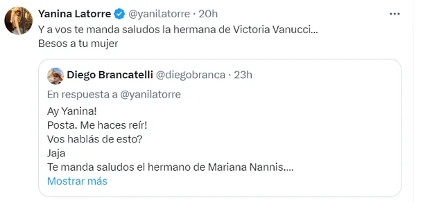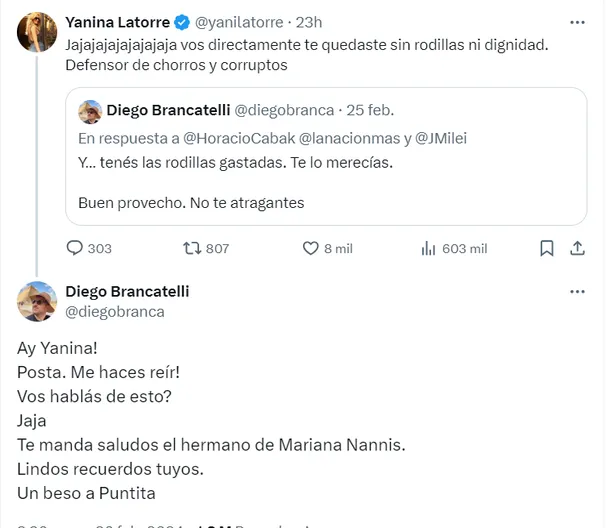Ante esto, Yanina Latorre no dudó en responderle a Diego Brancatelli de manera muy tajante. «Jajajajajajajajaja vos directamente te quedaste sin rodillas ni dignidad. Defensor de chorros y corruptos», comenzó diciendo la panelista de LAM, a lo que Diego Sumó: «Ay Yanina! Posta. Me haces reír! Vos hablás de esto? Jaja Te manda saludos el hermano de Mariana Nannis. Lindos recuerdos tuyos. Un beso a Puntita».