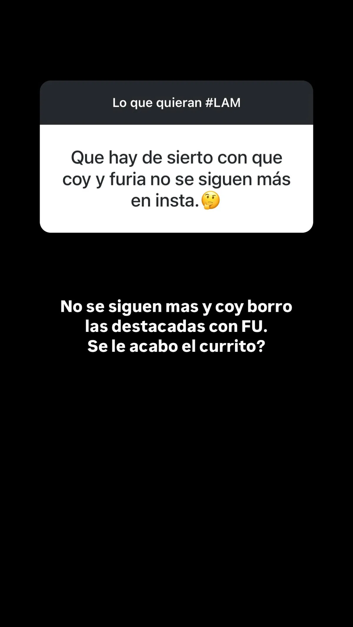 «¿Qué hay de cierto con que Furia y Coy no se siguen más en Instagram?», quiso saber un usuario. “No se siguen más. Coy borró las destacadas con FU. ¿Se le acabó el currito?”, respondieron desde las redes de LAM (América TV).