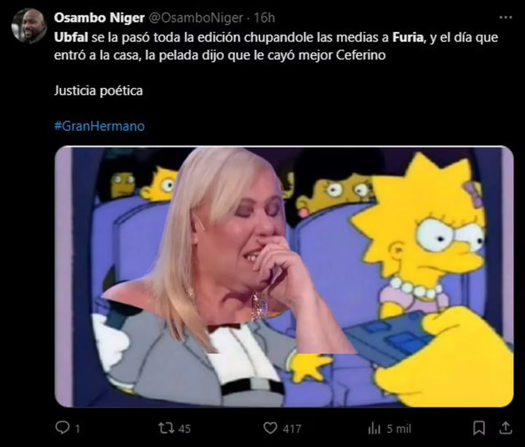 Al escuchar que Furia había halagado al escritor y no a la periodista, los internautas no tardaron en volver tendencia lo que había pasado. “Lo primero que hizo Furia cuando se fue Ubfal fue decir QUE AMA A CEFERINO”, “No puede ser Furia diciendo que la quiere a La Ubfal, pero que lo ama a Ceferino jajaja. No se imagina que es el líder anti furia” y “El peor karma de la Ubfal será enterarse de que Furia ama a Ceferino”, fueron algunos de los comentarios en X.