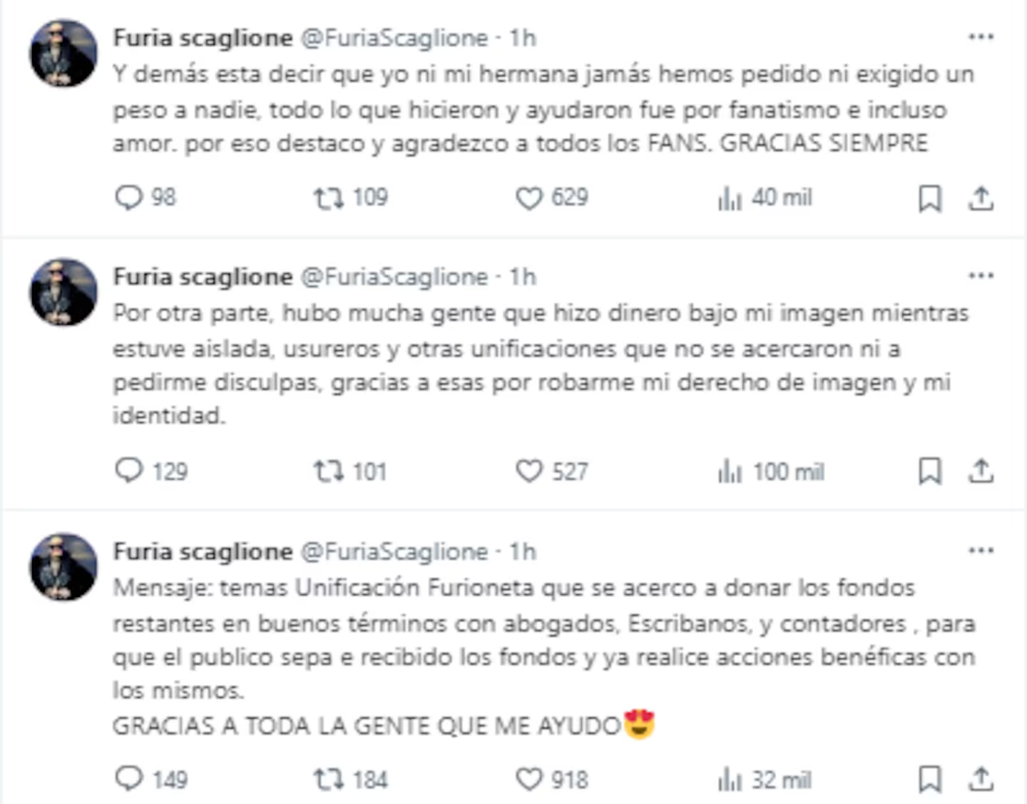 Luego apuntó: “Hubo mucha gente que hizo dinero bajo mi imagen mientras estuve aislada, usureros y otras unificaciones que no se acercaron ni a pedirme disculpas, gracias por robarme mi derecho de imagen y mi identidad”.