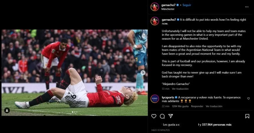 Este martes, Garnacho compartió un mensaje en inglés en su cuenta de Instagram: «Es difícil poner en palabras cómo me siento ahora mismo. Lamentablemente, no voy a estar disponible para ayudar a mi equipo y mis compañeros en los partidos que se vienen, una parte muy importante de la temporada para nosotros en Manchester United», comenzó.
