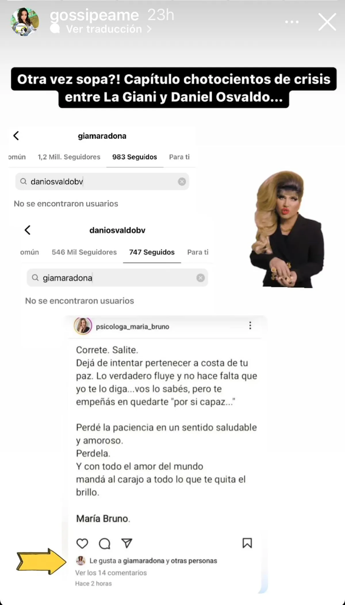 Así lo hizo saber Pochi, la instagramer de la cuenta Gossipeame, quien desde sus historias virtuales demostró que Gianinna dejó de seguir al ex de Jimena Barón, así como también Osvaldo le dio «unfollow» a la hija de Diego Maradona.
