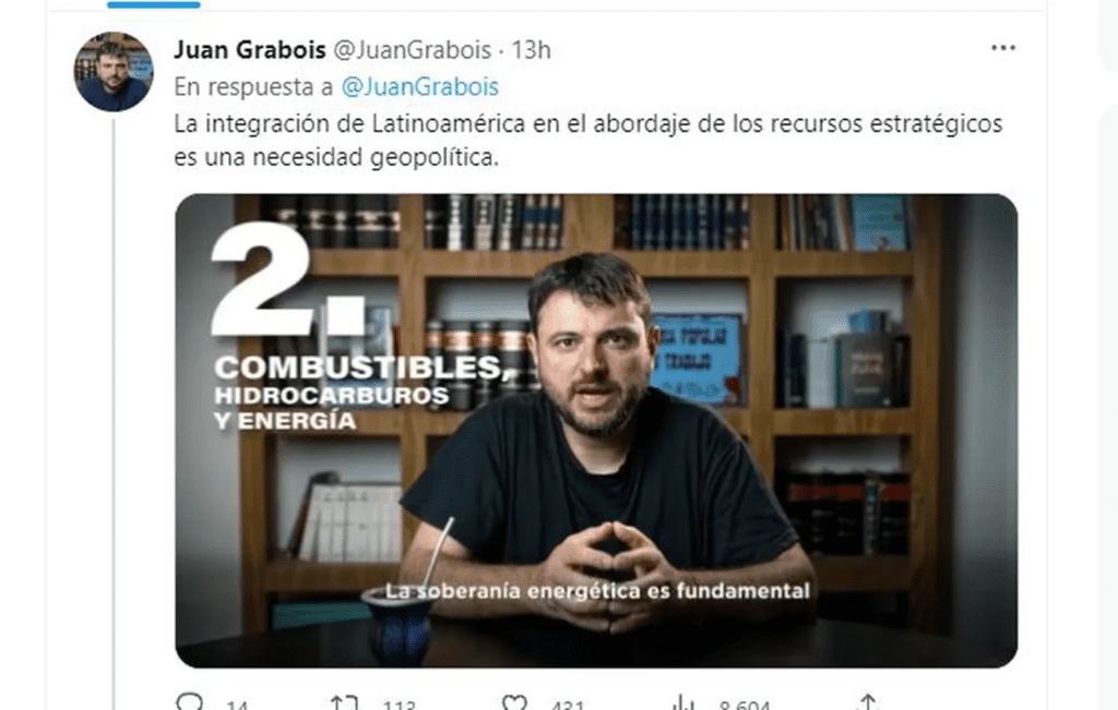 “Les dejo el Capítulo 3, parte 1 de las propuestas sobre Recursos Estratégicos: litio, combustibles y energías”, menciona en el video.