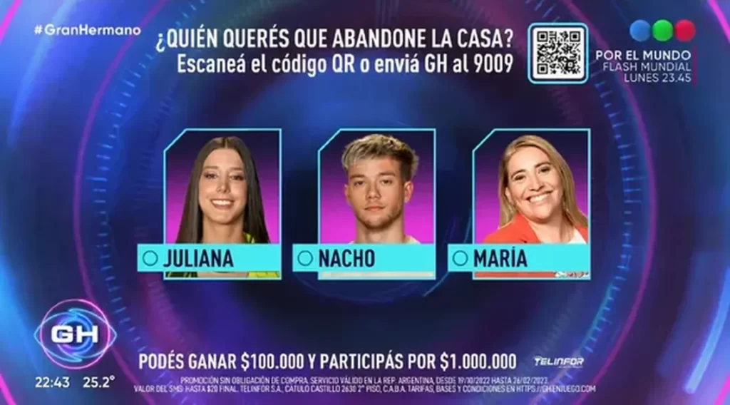 Finalmente, la última placa de la noche para decidir la sexta eliminada de «Gran Hermano 2022» quedó entre María Laura y Juliana, Santiago del Moro pidió el cierre definitivo de las votaciones y volvió a ingresar a la casa “más famosa del mundo” para preparar a las participantes “Juliana, María. María, Juliana. Las despedidas son tristes pero aquí estamos, una hoy sale por la puerta principal y la espero acá”.