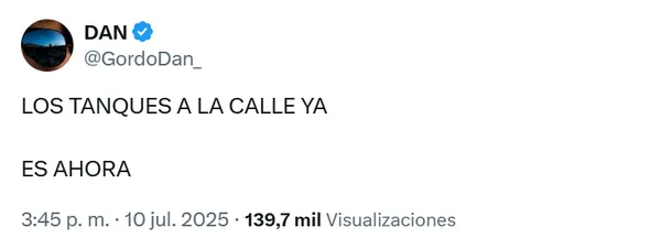 «LOS TANQUES A LA CALLE YA. ES AHORA», escribió Parisini en su cuenta de X. El Gordo Dan vive del dinero del Estado, como su madre, llamada Alejandra Olmedo, y su pareja.