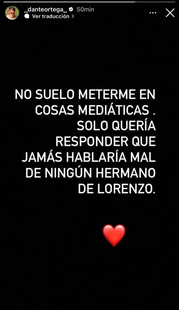 Dante Ortega, el hijo que Valdés tuvo con Sebastián Ortega en 2001, también disparó contra la influencer. “No suelo meterme en cosas mediáticas. Solo quería responder que jamás hablaría mal de ningún hermano de Lorenzo”, señaló él en su perfil de Instagram para apoyar a su mamá.