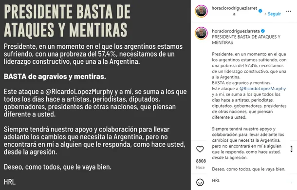 En un posteo realizado anoche en la red social Instagram, titulado «Presidente, basta de ataques y mentiras», Larreta expresó: «Presidente, en un momento en el que los argentinos estamos sufriendo, con una pobreza del 57,4%, necesitamos de un liderazgo constructivo, que una a la Argentina. Basta de agravios y mentiras».