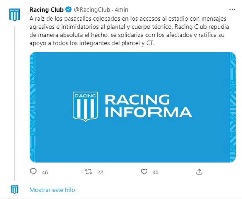 “A raíz de los pasacalles colocados en los accesos al estadio con mensajes agresivos e intimidatorios al plantel y cuerpo técnico, Racing Club repudia de manera absoluta el hecho, se solidariza con los afectados y ratifica su apoyo a todos los integrantes del plantel y CT.