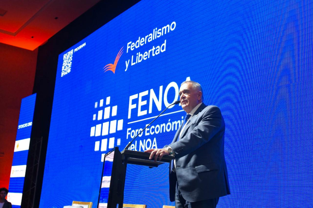 El gobernador Osvaldo Jaldo, participó este viernes del Foro Económico del NOA (FENOA), organizado por la Fundación Federalismo y Libertad que se realizó en un hotel ubicado en el ex Mercado de Abasto.