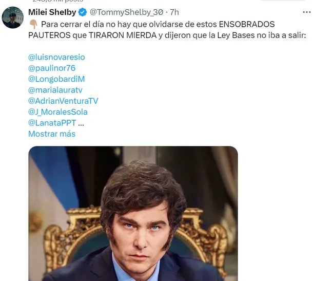 «Para cerrar el día no hay que olvidarse de estos ENSOBRADOS PAUTEROS que TIRARON MlERDA y dijeron que la Ley Bases no iba a salir: @luisnovaresio @paulinor76 @LongobardiM @marialauratv @AdrianVenturaTV @J_MoralesSola @LanataPPT NO LA VEN, LA TIENEN RE CONTRA ADENTRO», escribió un troll oficialista al que Milei replicó en su cuenta oficial.