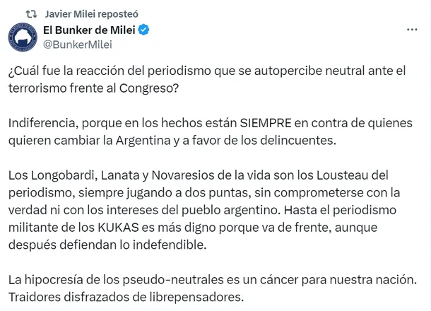 No fue el único posteo que el Presidente le dedicó a periodistas, macristas todos ellos, por eso sorprendió la postura del libertario.