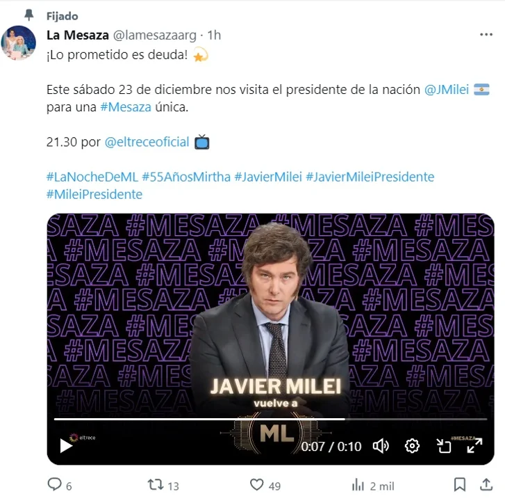 «¡Lo prometido es deuda! Este sábado 23 de diciembre nos visita el presidente de la nación, Javier Milei para una mesaza única, a las 21:30 por eltrece», anunciaron desde la cuenta oficial de X del programa que conduce la diva.