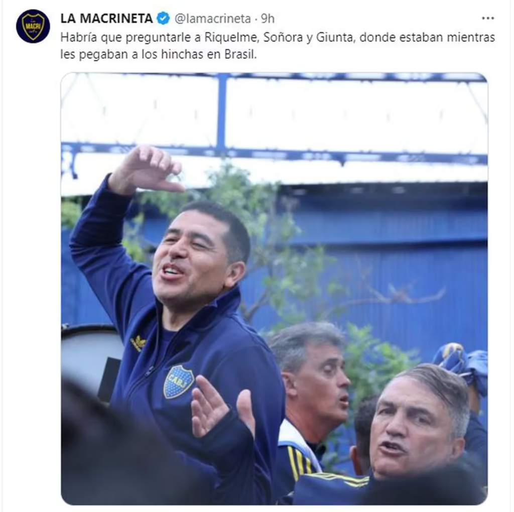 “Habría que preguntarle a Riquelme, Soñora y Giunta, donde estaban mientras les pegaban a los hinchas en Brasil”, dice el tuit que likeó el líder libertario.